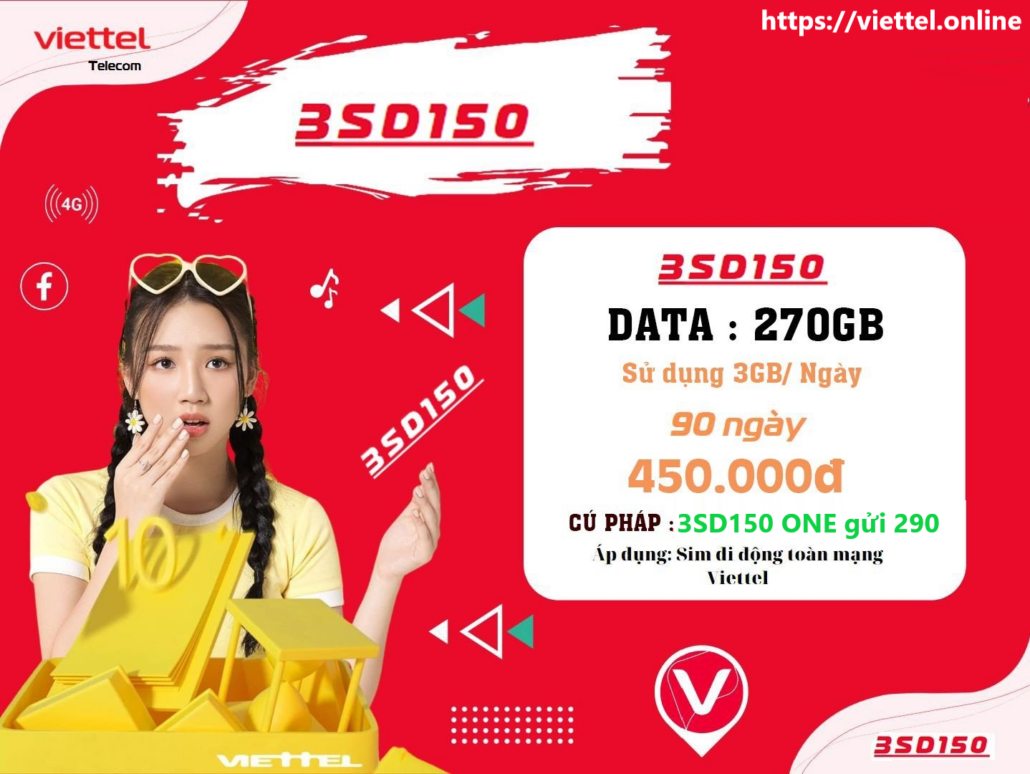 Sở dĩ gói 3SD150 Viettel thu hút được nhiều lượt đăng ký và trở thành một trong những gói 4G viettel 450k 3 tháng thành công của hệ thống Viettel chúng tôi như vậy bởi những ưu đãi rất hấp dẫn mà nó đem lại. Cụ thể, chỉ với 450.000vnđ cho 3 tháng sử dụng bạn nhận được ngay 270Gb data truy cập mạng internet tốc độ cao trong vòng 90 ngày tức là 3 tháng sử dụng ( 3Gb sử dụng trong 1 ngày ).